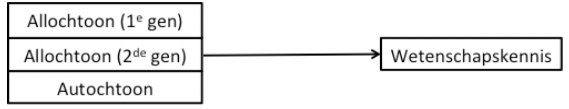 Alternatieve hypothese (H1): Er is in de populatie wel een verschil in wetenschapskennis tussen de drie groepen leerlingen (autochtoon, allochtoon eerste generatie, allochtoon tweede generatie).