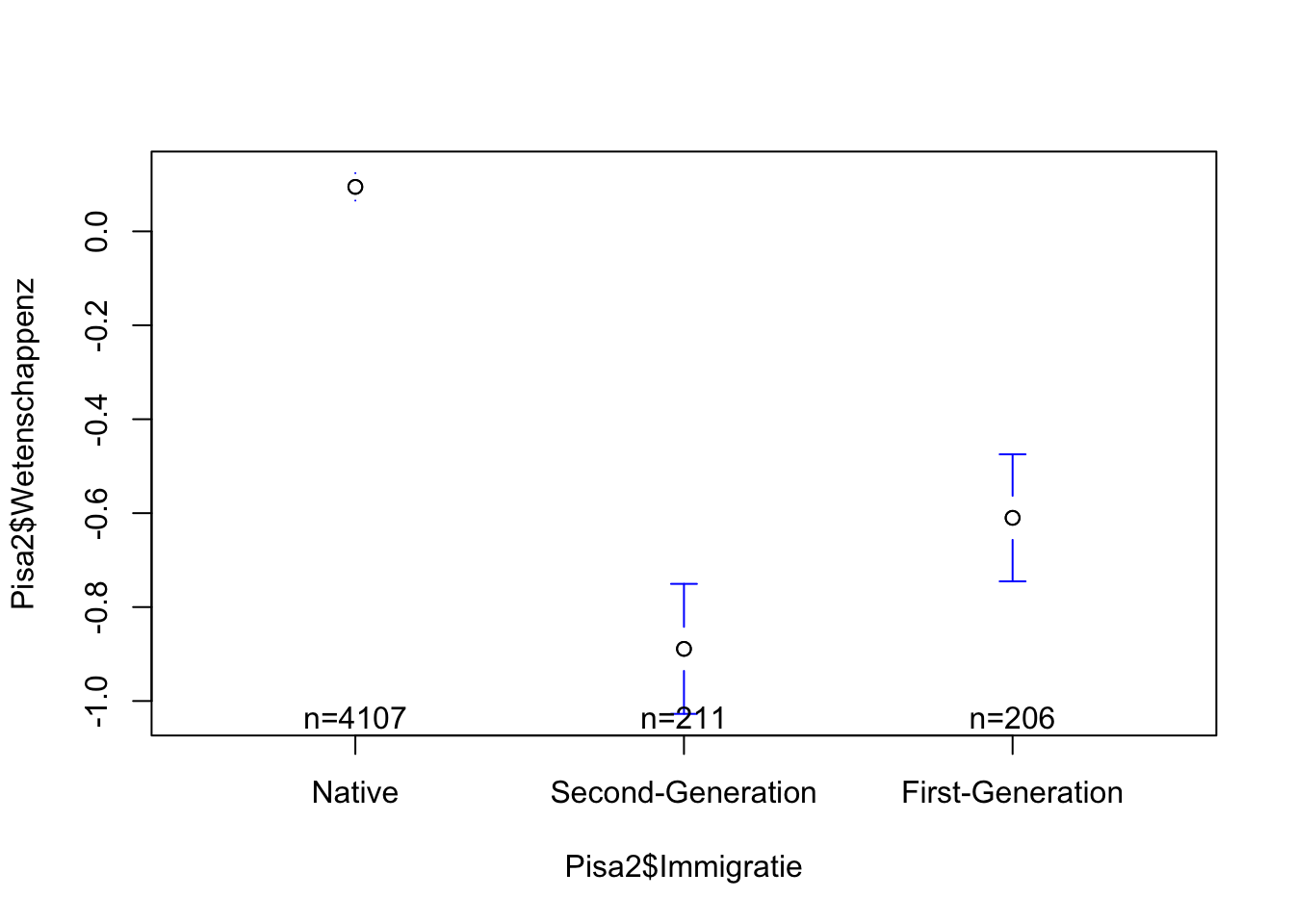 errorbar(Pisa2$Wetenschappenz ~ Pisa2$Immigratie)