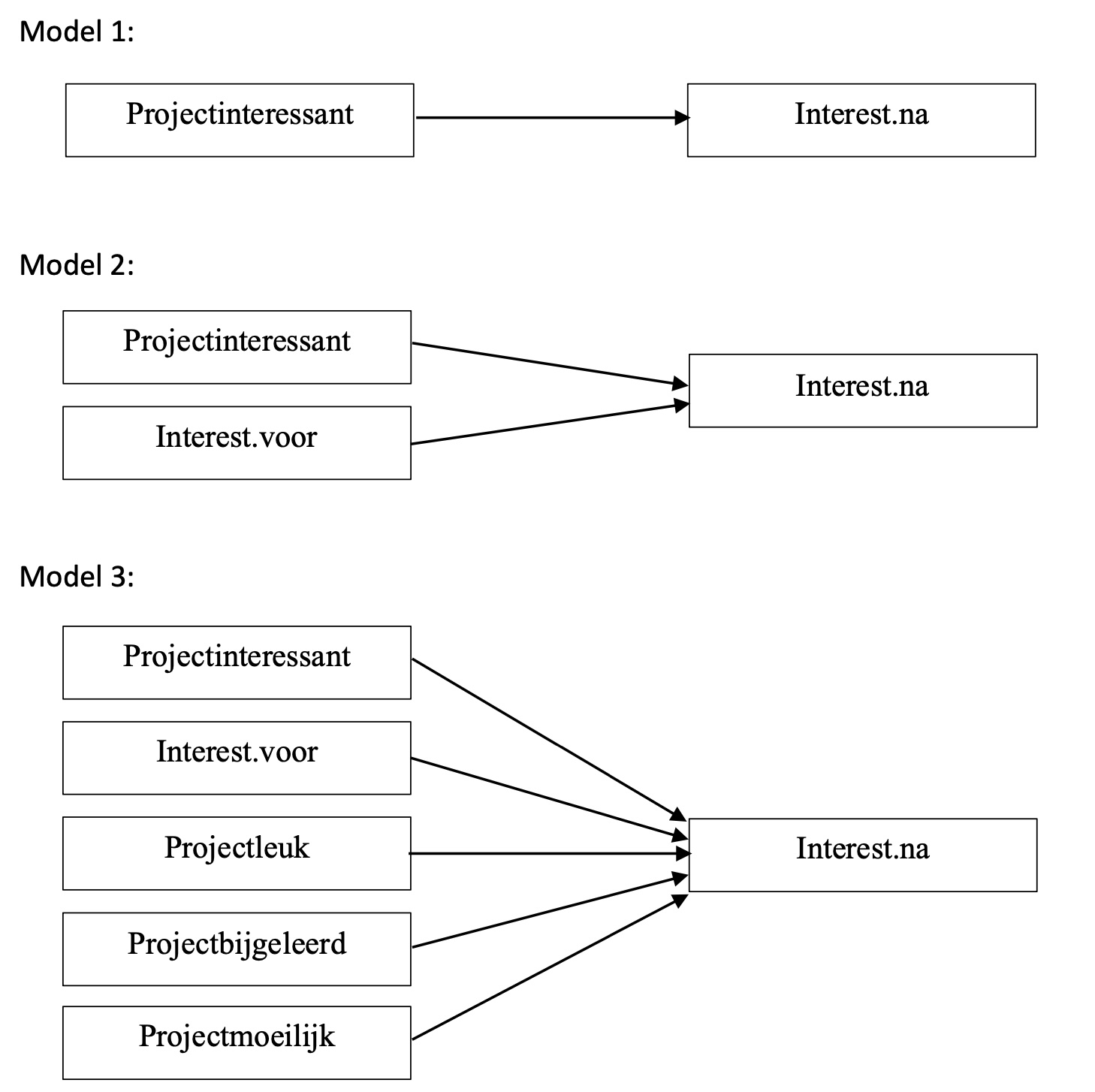 \(\text{Interest.naZ} = \beta_{0} + \beta_{1} \cdot \text{Projectinteressant2} + \beta_{2} \cdot \text{Interest.voorZ} + \beta_{3} \cdot \text{ProjectbijgeleerdZ} + \beta_{4} \cdot \text{ProjectmoeilijkZ}\)