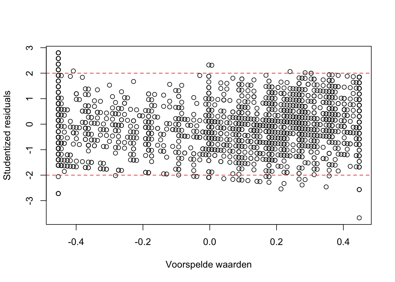 Grafiek ‘Scale-location plot’: de rode lijn in de plot loopt min of meer recht. Dit duidt op homoscedasticiteit.